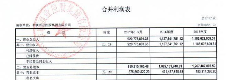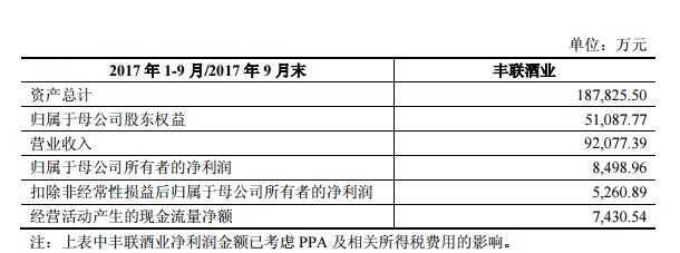 當天,老白干還發布了《豐聯酒業控股集團有限公司審計報告》,報告指出2017年1-9月份,豐聯酒業實現營業收入9.2億元,歸屬于母公司股東的凈利潤為8498.96萬元。而2016 年豐聯酒業收入為 11.2 億元,按照白酒年底是銷售旺季的市場規律,2017年豐聯酒業業績已經開始好轉。