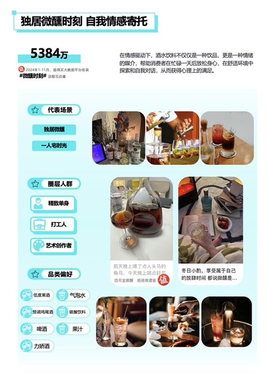 與此同時,居家微醺式飲酒和社交小酌式飲酒,也成為年輕消費者情感的寄托。不同的是,居家微醺更適配獨居場景,幫助消費者在忙碌一天后放松身心,在舒適環境中探索和自我對話,從而獲得心理上的滿足;2024年1-11月,值得買大數據平臺收錄的#微醺時刻#話題互動量超過5384萬。社交小酌則更適合年輕群體構建自己的同好搭子,比如在朋友歡聚、音樂節等場景,酒水已成為圈層和興趣社交的利器;美團數據顯示,大多數城市酒吧和LiveHouse訂單量增幅超60%。