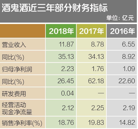 2019年3月26日,酒鬼酒發布2018年年度報告,宣布當期實現營收11.87億元,同比增長35.13%;實現歸母凈利潤2.23億元,同比增長26.45%。
