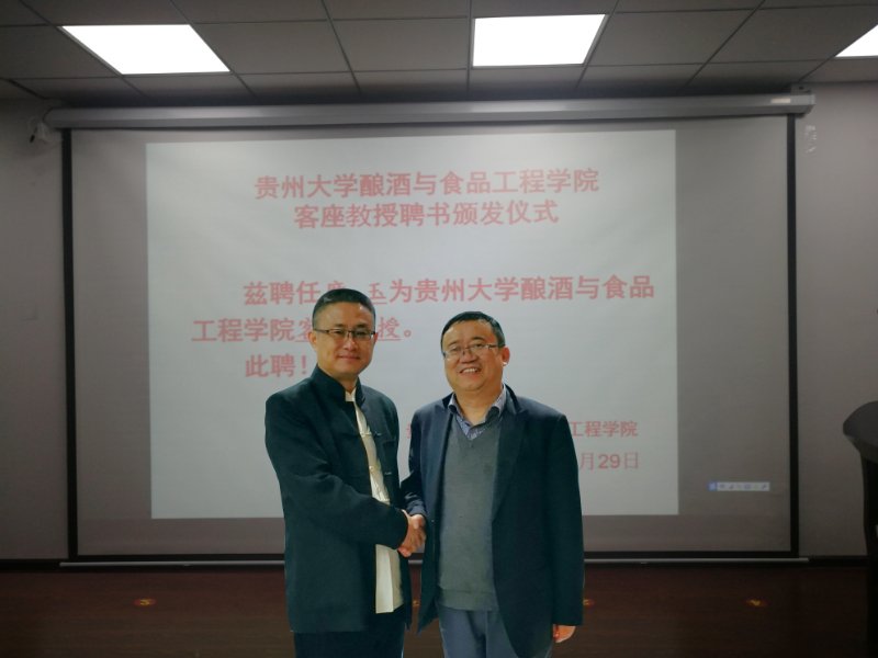 4月8日下午,貴州大學釀酒與食品工程學院客座教授聘書頒發儀式在貴陽高新區全球貴州博士俱樂部舉行。貴州大學釀酒與食品工程學院院長、博士生導師邱樹毅教授主持活動,并分別向全球貴州博士俱樂部創會主席李從國、全球貴州博士俱樂部交流中心執行秘書長席玉頒發客座教授證書。