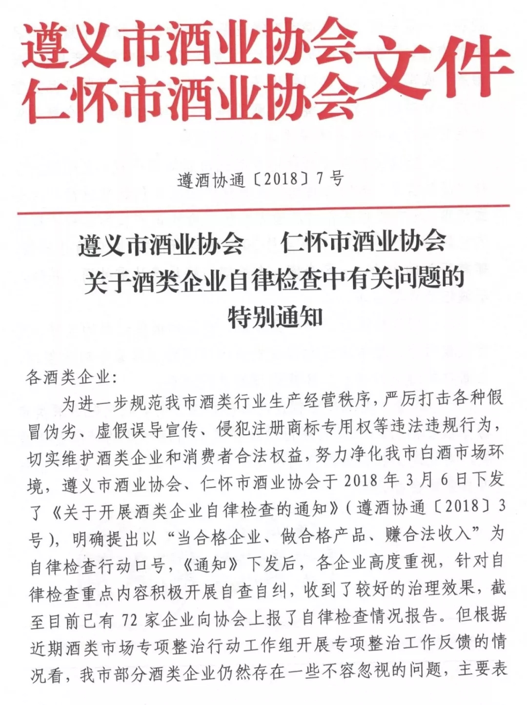 4月11日),遵義市酒業協會與仁懷市酒業協會聯合發布了《關于酒類企業自律檢查中有問題的特別通知》(以下稱《特別通知》),這是對自3月7日開始的酒類企業自律檢查行動中存在問題的總結和解決辦法。