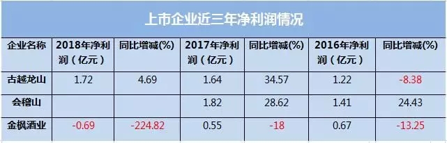 金楓酒業從2016年起即開始在營收及凈利潤上呈現逐年下降趨勢,且下降速度不斷加大,到2018年形成虧損,凈利潤迅減224.82%。而會稽山目前雖未披露2018年年報,但據其2018年半年報顯示,會稽山無論營業收入還是凈利潤增幅在上半年表現中都處于較低水平,營業收入增速不到1%。這和其2017、2016年年報數據比較來看,整體狀態并不容樂觀。
