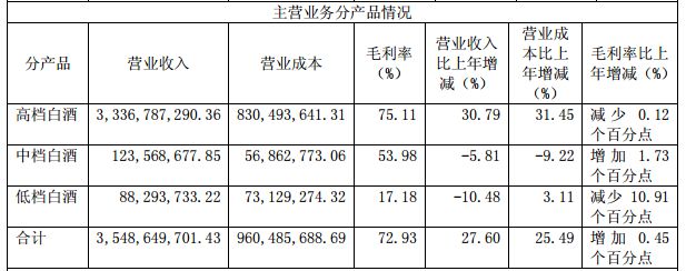 隨著口子窖2017年年度報告的出爐,口子窖以一定的領先優勢拿下了徽酒榜眼。2017年口子窖主營業務(酒類)實現營業收入35.48億元,其中高檔酒營業收入33.37億元,同比增長30.79%,在銷售額中占比達94.98%。而中檔酒和低端酒則分別下滑5.81%和10.48%,產品結構進一步優化。