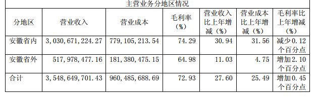 在銷售區域上2017 年口子窖在安徽省內市場進一步實施渠道下沉,繼續推進縣級及縣級以下區域市場深度運作,推進市場公司化管理,全面鞏固提升了省內整體市場份額,省內市場銷售收入較去年同期增長30.94%,達30.31億元;省外市場尋求與重點經銷商的戰略合作伙伴關系,繼續采取優勝劣汰的方式,保障了市場良性發展,2017 年省外市場較去年同期增加 11.03%,達5.18億元。