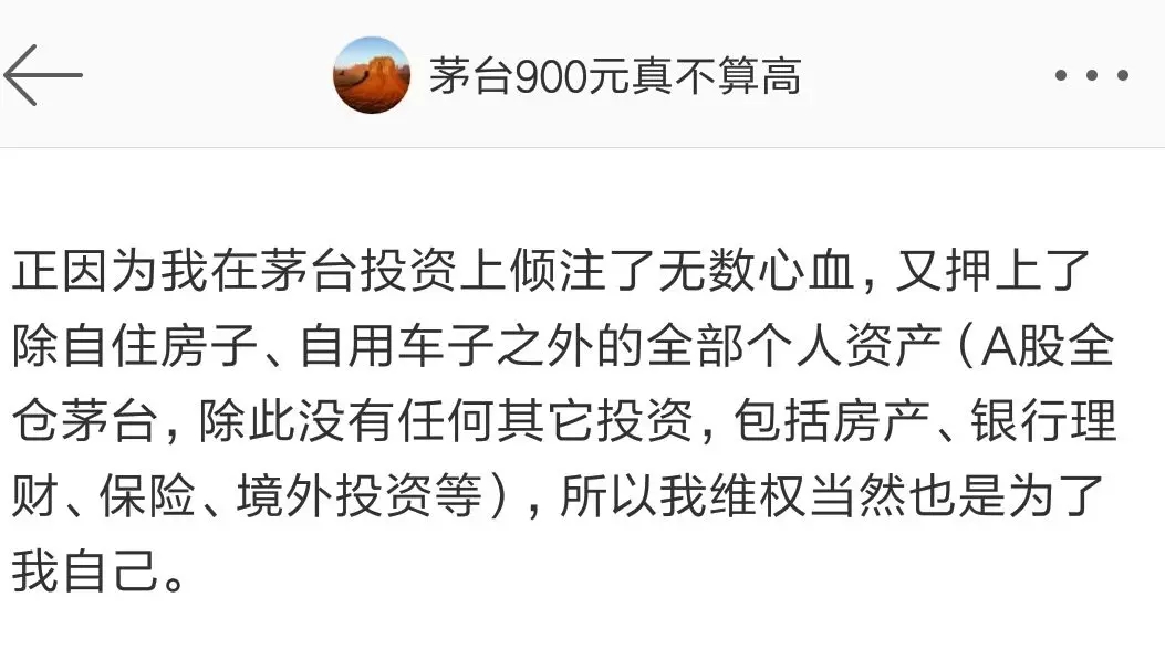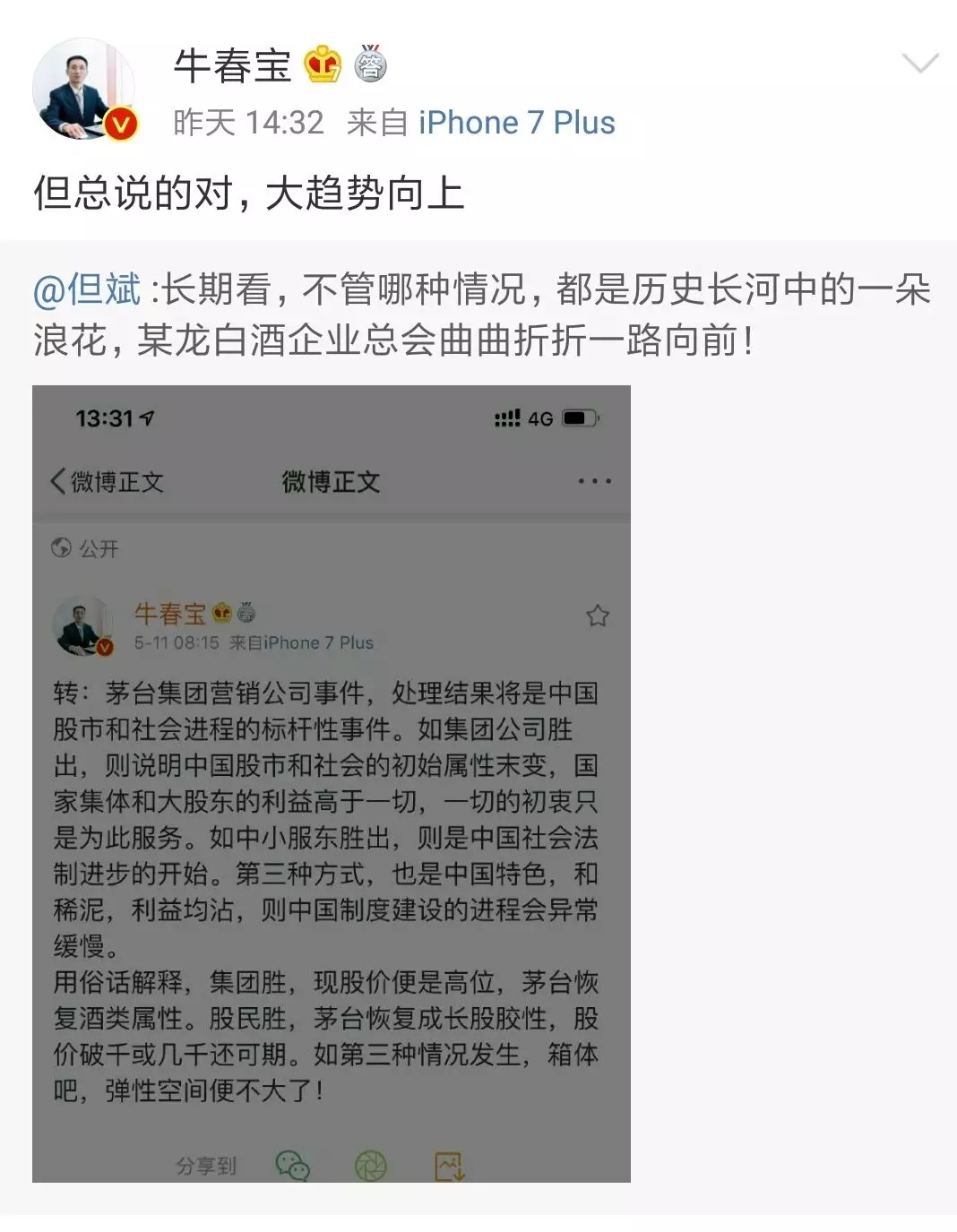 微博網友“茅臺900元真不算高”向記者表示,維權之路漫漫長,但是正因為自己對茅臺的投資傾注了無數心血,維權絕不會輕易放棄。5月11日,牛春寶轉發微博寫道:茅臺集團營銷公司事件,處理結果將是中國股市和社會進程的標桿性事件。如集團公司勝出,則說明中國股市和社會的初始屬性末變,國家集體和大股東的利益高于一切,一切的初衷只是為此服務。如中小服東勝出,則是中國社會法制進步的開始。第三種方式,也是中國特色,和稀泥,利益均沾,則中國制度建設的進程會異常緩慢。用俗話解釋,集團勝,現股價便是高位,茅臺恢復酒類屬性。股民勝,茅臺恢復成長股膠性,股價破千或幾千還可期。如第三種情況發生,箱體吧,彈性空間便不大了!但并隨后表示,從長期看,不管哪種情況,都是歷史長河中的一朵浪花,某龍白酒企業總會曲曲折折一路向前!