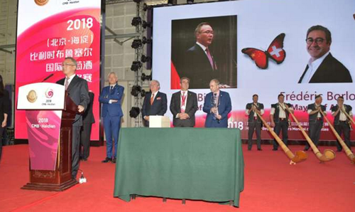 卜度安主席宣布,2019年布魯塞爾國際葡萄酒大獎賽將在瑞士艾格勒市政府和瑞士葡萄酒推廣局的支持下,于2019年5月2日至5日在瑞士的艾格勒鎮的世界自行車中心舉行舉辦;顒又,北京市海淀區政府區長戴彬彬為接旗儀式致辭,并鄭重地將代表著全球賽事的CMB葡萄酒獎杯遞給瑞士艾格勒市長弗雷德里克·博爾洛茲。