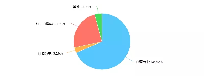 從婚宴用酒種類來看,白酒依然是主流趨勢,尤其是農村市場、縣級市場、普通城市市場,所占份額很大。而紅、白搭配成為新市場新趨向,尤其是一線城市市場、南方市場紅、白搭配趨勢明顯,選擇更加多樣性,這些市場相對富裕、消費觀念也更加前沿,紅、白搭配所需費用也更高,從經銷商層面來看,這類人群更加注重檔次,讓婚禮看上去“更有面子”,增強消費者的消費體驗也許會成為突破口。白、脾搭配也有部分市場份額,雖然由于消費者觀念等問題,還不是主流傾向,但是隨著近幾年來市場整體更加開放化、多樣化,白、脾搭配可能成為縣、鄉兩級市場消費的新趨勢。