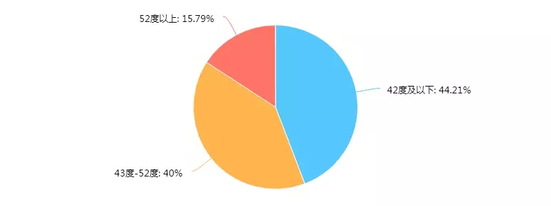 從婚宴產品的流行度數來看,42度及以下、43度-52度的度數區間在全國所占份額相同,各占40%。一個有趣的現象是一線城市市場52度以上區間占很大份額,這和前面分析的一線城市多選擇全國一線品牌有關,而很大一部分高端酒的經典產品(53度茅臺酒、52度五糧液等)的度數也相對較高。從樣本分析看出在婚宴市場度數對婚宴產品的選擇其實影響較弱,他們選擇產品的種類及價格的時候其實已經定了度數的基調。