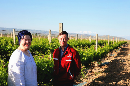 葡萄酒大師趙鳳儀女士(左)與中信國安葡萄酒業首席釀酒師弗萊德·諾里奧(右)在中信國安葡萄酒業位于新疆天山北麓的瑪納斯葡園