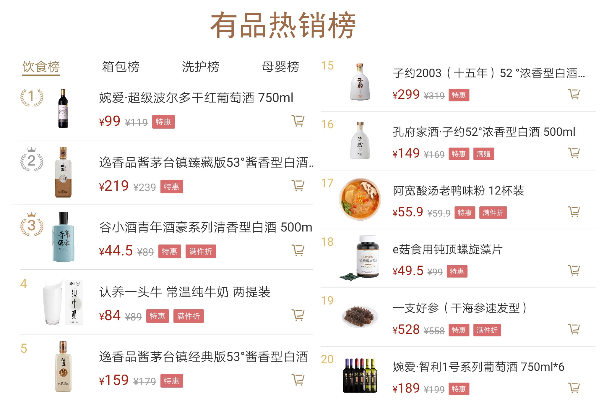 2019年6月9日,小米有品“618年中大促”過半,平臺上各大廠商競爭日益白熱化。小米有品頭部商家逸香強勢發力,旗下婉愛、子約、品醬三個系列六款產品均榮登有品飲食熱銷榜。其中婉愛·超級波爾多與品醬臻藏包攬榜單前兩名,品醬經典位列第五位,子約系列兩款產品分別位于第十五、十六位,婉愛·智利1號排名第二十位。同一商家的六款產品包攬飲食熱銷榜前兩名不多見,六款產品同時登榜更為少見,從中不難看出,逸香備戰小米有品618底氣十足。