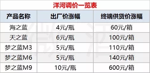 其中,出廠價方面,海之藍上漲4元/瓶,天之藍上漲6元/瓶,夢之藍M3、M6、M9分別上漲5元/瓶、5元/瓶和10元/瓶;終端供貨價方面,海之藍上漲60元/箱 ,天之藍上漲100元/箱,夢之藍M3、M6分別上漲110元/箱、140元/箱,平均漲幅達到百元,M9更是大幅提高600元/箱。