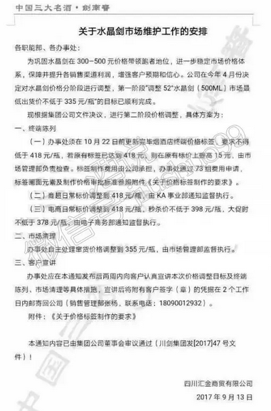 文件中指出,劍南春集團公司在第一階段“調整水晶劍(500ML)市場最低出貨價不低于335元/瓶”目標已順利完成,目前執行第二階段的價格調整,明確要求向客戶宣講本次價格調整目標及終端陳列、市場清理等具體措施。