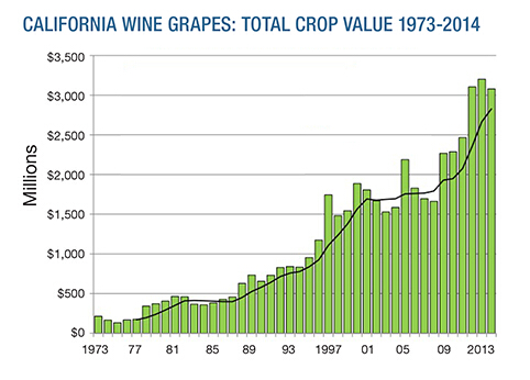 1973年,加州葡萄總產值約4000萬美元,之后出現了大幅的上漲。而現在達到了30億美元以上。同期,葡萄總產量由100萬噸增加至了400萬噸。每噸的價格由200美元上升至了750美元(納帕和索諾瑪縣要略高一點)。