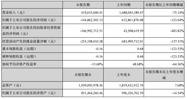 8月1日,上海百潤投資控股集團股份有限公司(以下簡稱:百潤股份)發布半年度公告,公告稱報告期內百潤股份實現營業收入4.20億元,同比下降75.14%,歸屬于上市公司股東的凈利潤-1.45億元,同比下降123.64%。