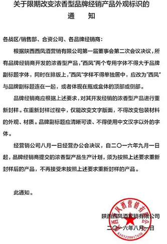 西鳳下發“限期改變濃香型品牌經銷產品外觀標識的通知”