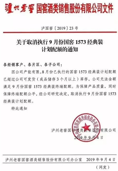 因公司產能有限,8月份已執行的國窖1573經典裝計劃配額已超過可發貨(成品儲存3個月以上)庫存,公司無法全額滿足9月份國窖1573經典裝終端配額。為保障產品質量,同時保障終端配額公平,經公司研究決定,取消執行9月份國窖1573經典裝計劃配額。