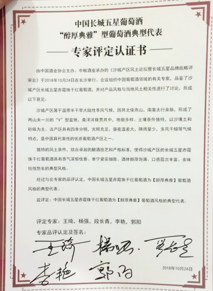 獨特的風土條件,結合卓越的釀酒技藝和嚴格標準,使得沙城產區的長城五星赤霞珠干紅葡萄酒具有香氣濃郁優雅、單寧緊實細致、酒體醇厚飽滿、口感層次豐富、余味怡悅悠長的典型風格。經過與會專家的品評認定,長城五星赤霞珠干紅葡萄酒為【醇厚典雅】葡萄酒風格的典型代表。