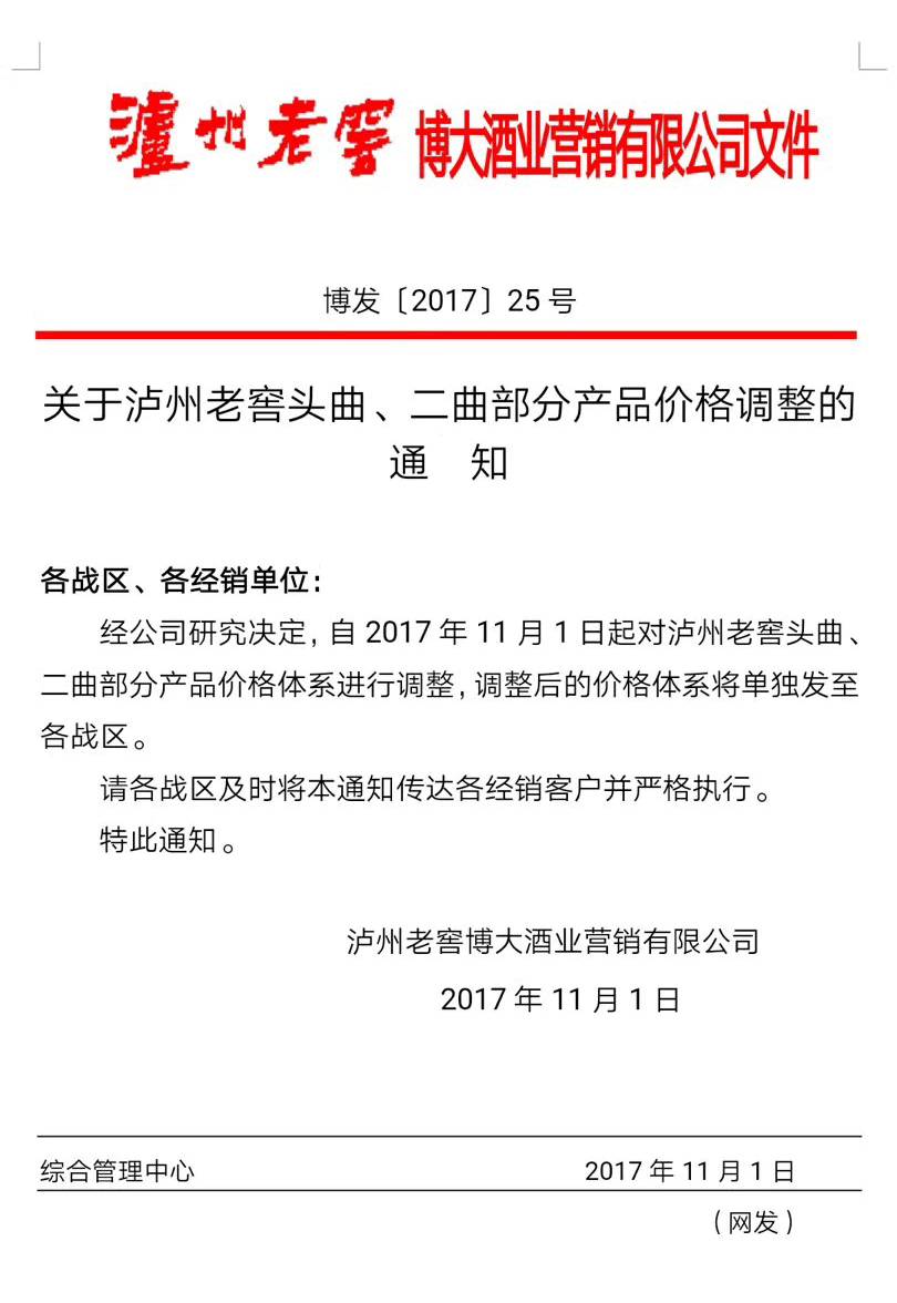11月1日,瀘州老窖博大酒業營銷有限公司下發了《關于瀘州老窖頭曲、二曲部分產品價格調整的通知》。核心內容為:自2017年11月1日起,對瀘州老窖頭曲、二曲部分產品價格體系進行調整。