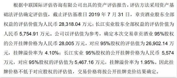 4.本次交易章貢酒業 95%股權的公開掛牌價格為人民幣 2.80億元,對應 95%股權的評估值為2.69 億元;長江實業 95%股權的公開掛牌價格為人民幣 0.58億元,對應 95%股權的評估值為 0.55億元。