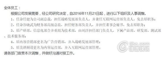 原網酒網戰略管理部VP任健接任公司副總裁一職,并擔任戰略發展部負責人,同時任命谷曉武為財務總監,同時接替張智健擔任董事會秘書一職。網酒網原副總裁和財務總監均已離職,根據公開資料顯示,從2013年截至到現在,網酒網副總裁一職先后進行了兩次變動,自2013年11月份,趙凡從網酒網離職后,2014年初,由原來的當當網CMO郭鶴出任網酒網副總裁。目前,根據已有的信息,郭鶴和徐濤均擔任過副總裁一職,至于是否是其中一人離職尚不得知。在網酒網的內部郵件中,網酒網同時對公司的架構進行了調整,其中,原產研部、信息化部合并重組為技術部,內容營銷部更名為廣告營銷部,并入到戰略發展部,而原美酒頻道更名為內容運營部并入到互聯網運營部。