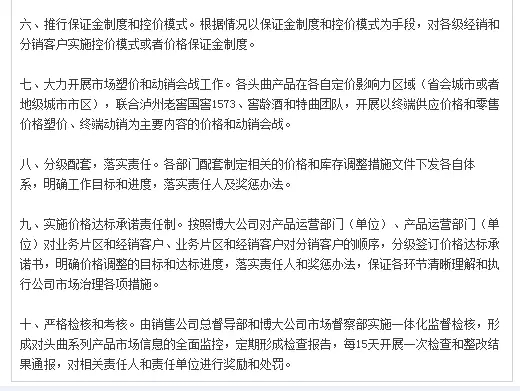 記者今日(11月25日)獲悉,瀘州老窖博大酒業發布關于主力產品頭曲產品市場治理的10條通知,其中提出要求確定各頭曲產品的市場流通價格目標等多項市場舉措,各項舉措均指向頭曲系列市場流通價格提升20%這一目標。
