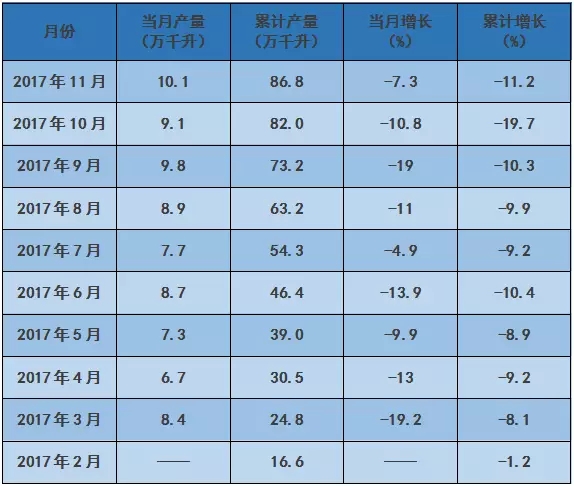 據國家統計局發布的最新數據顯示,2017年1-11月,全國葡萄酒產量達86.8萬千升,同比下滑11.2%;僅11月全國葡萄酒產量達10.1萬千升,同比下滑7.3%。