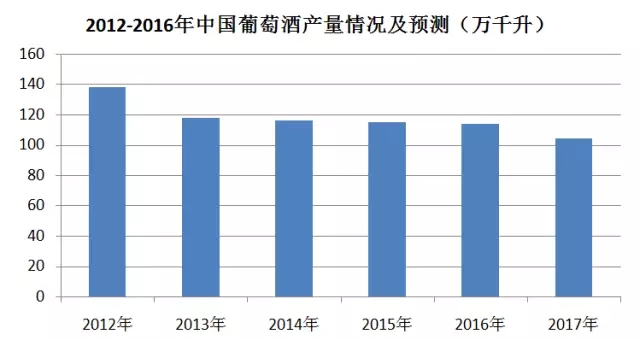 我國葡萄酒產量自2003年以來,葡萄酒產量經歷了十年的飛速上漲,而2013年開始,國產葡萄酒呈現逐年下滑趨勢。2016年全國葡萄酒產量達113.7萬千升,同比下滑2.1%。對比2012年,足足減少了24.7萬千升。據相關預測,預計2017年中國葡萄酒產量將下滑至101.5萬千升,而這個估值仍在不斷下降。