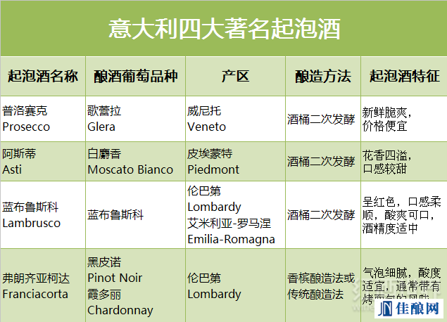 意大利是著名的葡萄酒生產國,按照行政區域劃分共有20個葡萄酒產區,用來釀酒的葡萄品種共約350種。意大利起泡酒非常有名,種類也很多。有些比較常見,有些則聽說不多。下面佳釀網小編將為大家詳細介紹意大利最主要的四類起泡酒。