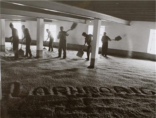 酒廠的翻麥工人在大麥發芽地板上劃出“Laphroaig”(拉弗格)字樣,攝于1965年