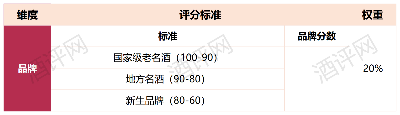 酒評網將產品的品牌力量化為相應的分值。比如,國家級老名酒分值區間為90至100分,四大名酒、八大名酒、十七大名酒與五十三優都有不同分值的評定;地方性名酒分值區間為80至90分;新生品牌分值區間為60至80分。品牌力滿分為100分,在評測體系中權重系數為0.2。