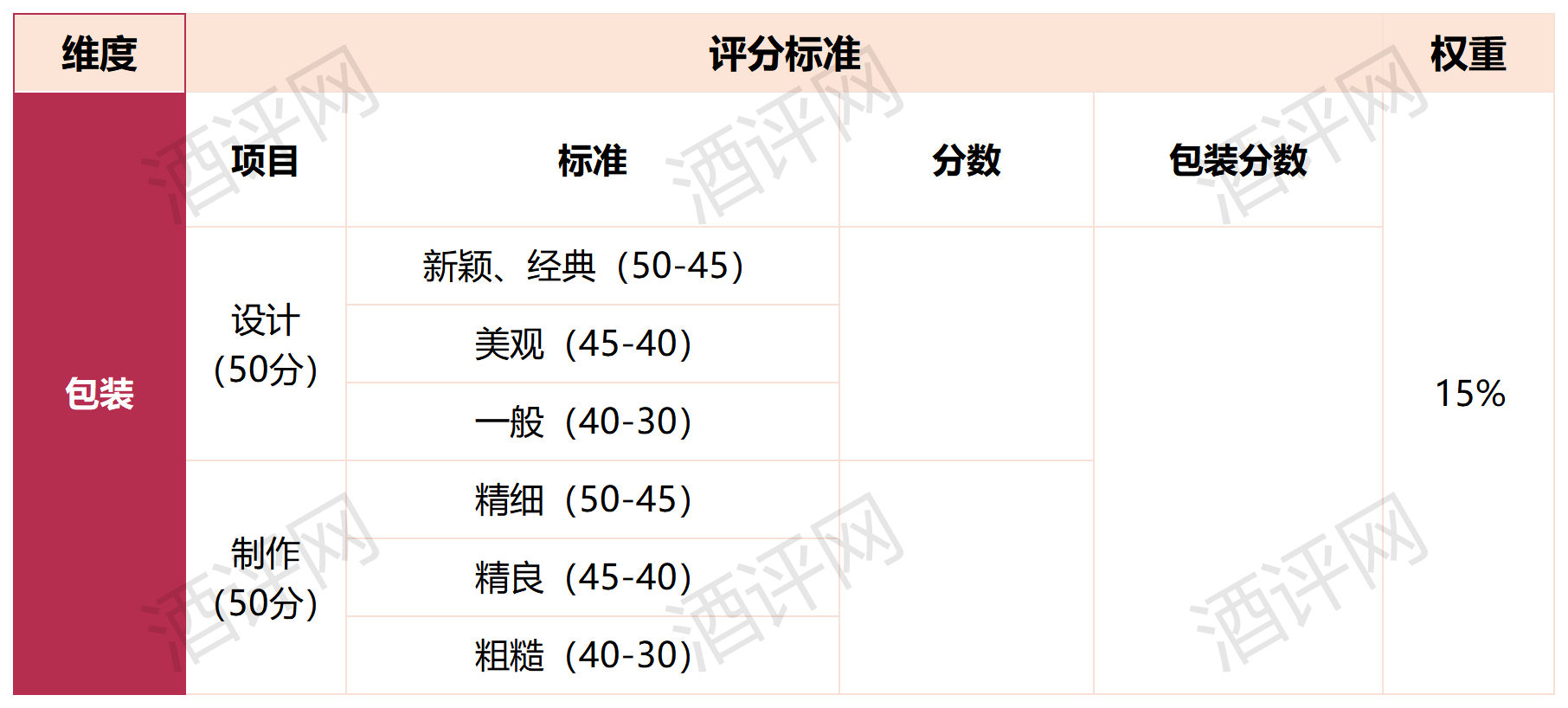 同樣酒質的酒,如果放在精美的包裝里,會更吸引消費者,而如果放在粗陋的包裝里,卻會被質疑品質不夠好。因此,酒評網從白酒包裝的設計創意和制作工藝兩方面分別做出了打分,兩個方面滿分分別為50分,總計100分,在評測體系中權重系數為0.15。