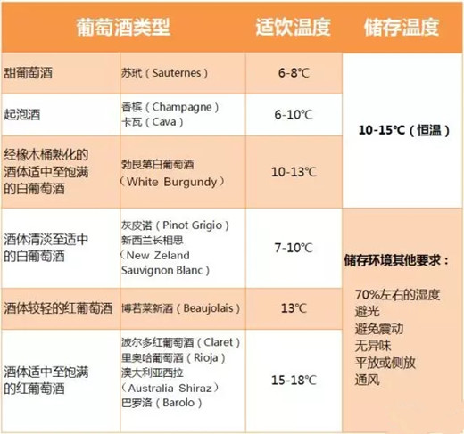 如果你久經酒場,嘗遍美酒無數,相信你對不同種類葡萄酒適飲溫度的表格不會感到陌生;如果你初嘗美酒滋味,對葡萄酒的世界充滿好奇,那么這張表格一定是你所需要的。不管你是早已銘記于心,還是求知若渴,都先來看看這張適飲溫度表格吧!