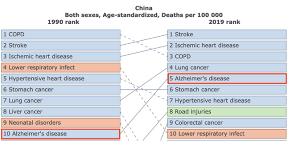 《General Psychiatry》雜志2022年刊載《The China Alzheimer Report 2022》一文指出,2019年,中國阿爾茨海默癥和相關癡呆癥患者數已超過1300萬,占全球的四分之一,已成為導致中國居民死亡的第五大病種。