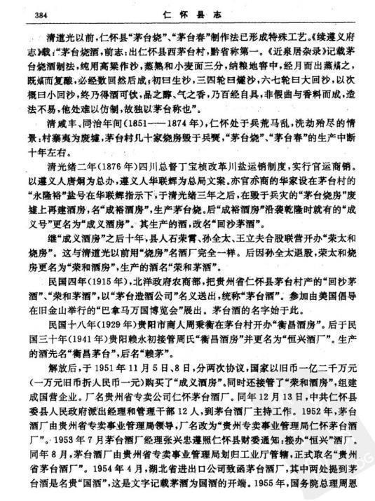 最早明確記載茅臺酒的《仁懷草志》,其物產篇中就曾寫道:“城西茅臺村制酒,全黔第一。”稍后的《黔語》更進一步寫道:“茅臺村隸仁懷縣。濱河之人善釀,名茅臺春,極清洌。”這些史料均證明,當時茅臺村的釀酒業,已初具了規模與名氣。
