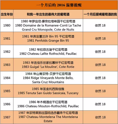 看似簡簡單單的一張表格瞬間引發無數人的深思,更是令人神傷。原本按照國家法定年齡,年齡最大的 80 后孩子都要 15 歲了。然而事實上,不少 80 后和 90 后忙于各種工作(當然不排除部分 90 后依然身在校園),甚至來不及談戀愛和成家。眼看 2015 年就要過完了,但這個溫馨提醒何必來得如此傷感?要知道,你出生那年還有這些偉大的葡萄來到這個世界上呢!所以說,以下這張才是當下最應刷屏的表格。