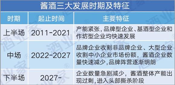 醬酒下半場:從2027年開始醬酒進入下半場,即頭部品牌競爭時代。這個時期,品牌和企業數量急劇減少,醬酒整體產能開始出現過剩,品牌進入頭部廝殺階段,行業前十的品牌格局基本穩定。醬酒產業的市場體量和濃香并駕齊驅,行業駛入白銀時代。
