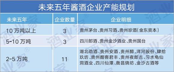 未來五年,醬酒產能規劃達到10萬噸以上的企業有3家:貴州茅臺、貴州習酒、貴州珍酒(金東資本);產能規劃達到5萬噸以上的企業有3家:四川郎酒、貴州金沙酒業、貴州國臺;規劃產能達到2萬噸以上的有11家:湖北勁酒、貴州安酒、貴州醇、洋河股份、肆拾玖坊、貴州酣客君豐、貴州夜郎古、習水龜仙洞酒業、四川仙潭、衡昌燒坊、金沙古酒等。