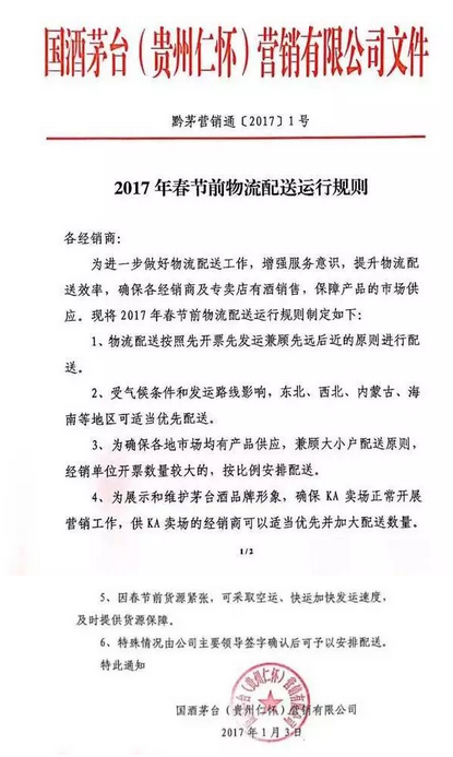就在2017年1月6日晚間,酒說記者獲悉,國酒茅臺(貴州仁懷)營銷有限公司在1月3日下發了《2017年春節前物流配送運行規則》,該規則是茅臺酒銷售公司2017年的1號文件。