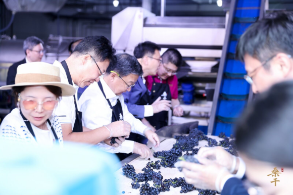 中糧長城桑干酒莊總經理于慶泉帶領嘉賓游覽桑干葡萄園,在專業人士的指導下參與西拉葡萄采收,了解釀酒葡萄的優良標準。