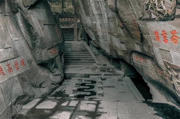 我們現在去流杯池不用乘船渡江,也不用再走幾里路。在現代化都市建筑的掩映下,流杯池依然是一方凈土。崩裂的大石并不在山上,而是在溝壑里,沿石階穿行在蜿蜒的石縫間,抬頭就是一片綠色。古老的樹根攀附在巖壁之上,四周樹林茂密,古意盎然。曲水流觴,就相融于這片清幽寧靜之中。