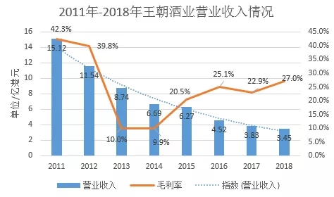 上圖所示,2011年至2018年,王朝酒業的營業收入連續下滑,從最初的15.12億港元下降至2018年的3.45億港元,收入縮水到不及當初的四分之一。但另一方面,王朝酒業的毛利率卻從2014年起開始有所回升,從9.9%一路上升到2018年的27%,這在一定程度上顯示出王朝公司盈利能力的增強,而這或許就意味著王朝“觸底反彈”的開始。