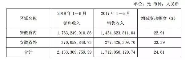 利潤持續增長的同時,外埠市場也得到了相應的發展。報告顯示,從2017年到2018年口子窖省內外市場銷售額均大幅增長,其中省內銷售額為17.63億元,增幅達22.91%。省外市場銷售額達到3.70億元,增幅達33.39%,而2017年口子窖省外市場增幅為11.03%。