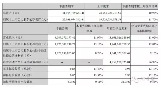 洋河股份三季報稱三季度公司營收40.90億元,同比增長11.97%;凈利潤12.76億元,同比增長13.12%。