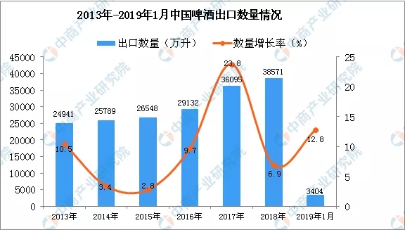 2017年中國啤酒出口量為36095萬升,同比增長23.8%;2018年中國啤酒出口量為38571萬升,同比增長6.8%。2018年中國啤酒出口量維持增長趨勢,但增長幅度有所減緩;2019年1月中國啤酒出口量為3404萬升,同比增長12.8%。