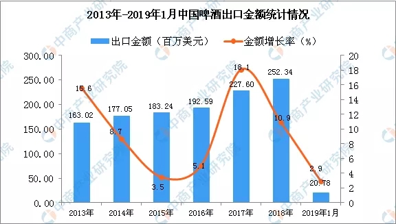 從金額方面來看,2013年-2018年中國啤酒出口金額逐漸增長,2019年1月中國啤酒出口金額為20.78百萬美元,同比增長2.9%。