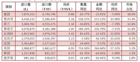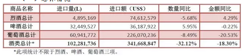 葡萄酒進口整體下滑。瓶裝酒量額雙降,降幅較大;散裝酒量額均升;葡萄汽酒數量降幅明顯,金額小幅走低。瓶裝酒進口額2.1億美元,同比下降21.6%,占葡萄酒進口總額的近94%。同時,須指出的是,根據海關數據,新增了大于2升、小于10升的葡萄酒分類,本月其進口量為12萬升,進口額為31萬美元,無同比。