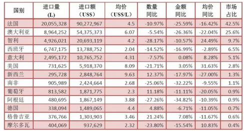 數據顯示,法國、澳大利亞、智利仍為進口瓶裝酒市場的三駕馬車,三者市場份額占比合計近78%,但本月三馬齊喑,量額均呈下行態勢;另一方面,其他的瓶裝酒進口來源地亦未擺脫陰霾,數據普遍走低,抑或勉強持平。
