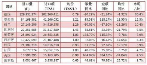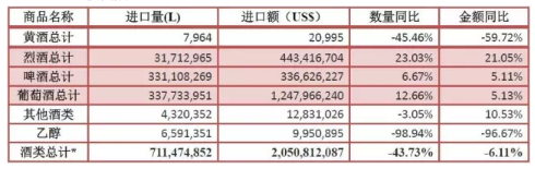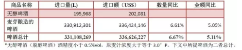 上半年啤酒進口量額雙增,增幅較小,其中,進口量3.3億升,同比增長6.7%,進口額3.4億美元,同比增長5.1%。