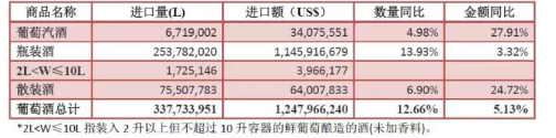 葡萄酒進口止跌上揚。其中,瓶裝酒量額雙漲,增幅較小,散裝酒、葡萄汽酒數量小幅增長,金額增長較明顯。瓶裝酒進口額11.5億美元,同比增長3.3%,占葡萄酒進口總額92%。