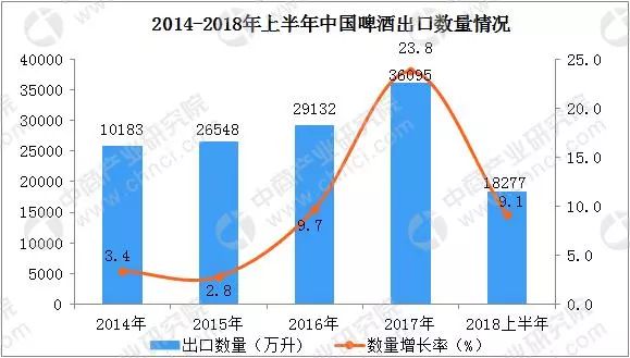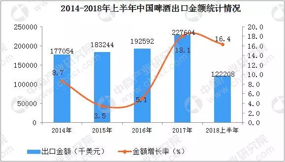 2018年6月中國出口啤酒金額方面,6月中國啤酒出口金額21.92百萬美元,同比增長17.1%。1-6月中國出口啤酒金額達122.21百萬美元,同比增長16.4%。